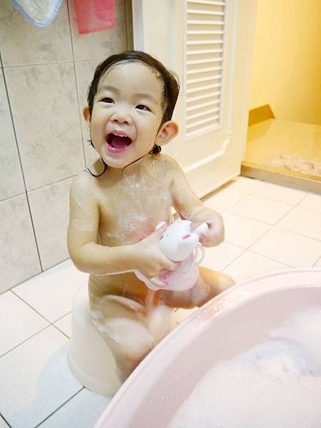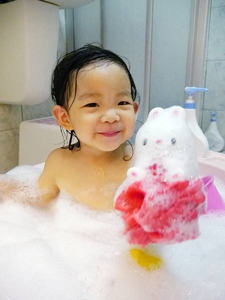 所以大概一歲半的以後,我就開始搭配沐浴球幫她洗澡了。