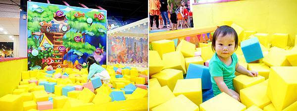 兩層樓的遊戲區塊,上面是泡棉積木,下面是感統球。
