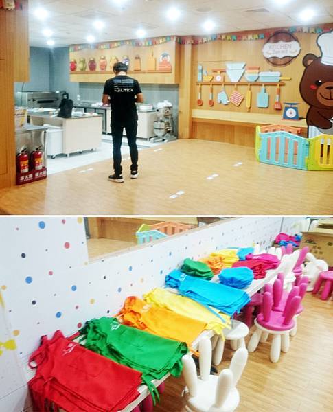 裡面還有烘培教室,連小圍裙和小廚師帽都準備好了~