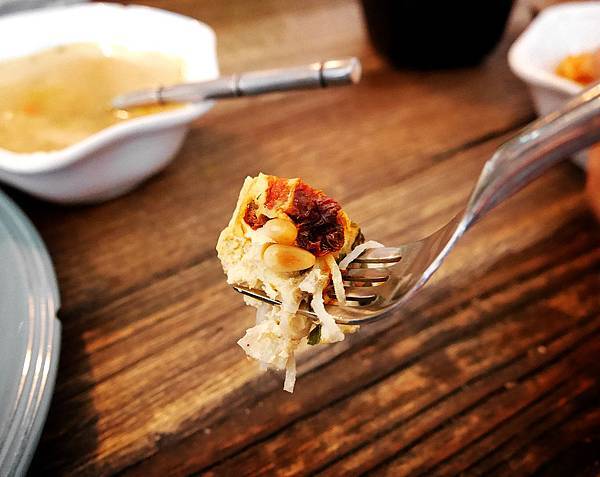 裡頭有機季節蔬菜、馬鈴薯、九層塔、山藥和自製風乾番茄、松子…(好豐富!)