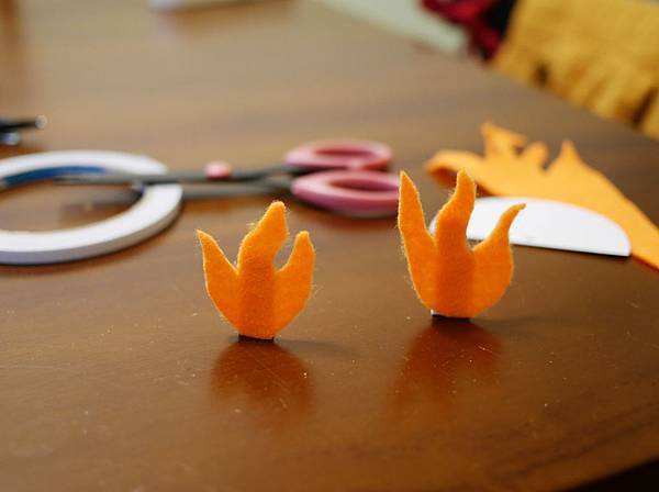 3.用雙面膠,把紙片黏在不織布上(這樣火焰就可以站立了)。