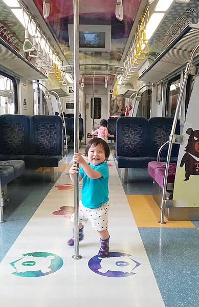 和一般區間車不同,車廂都是可愛的黑熊圖案+繽紛的色彩,