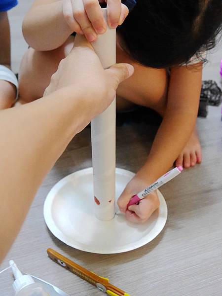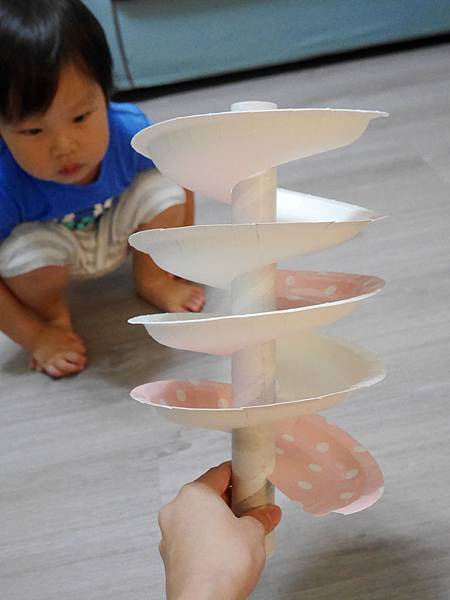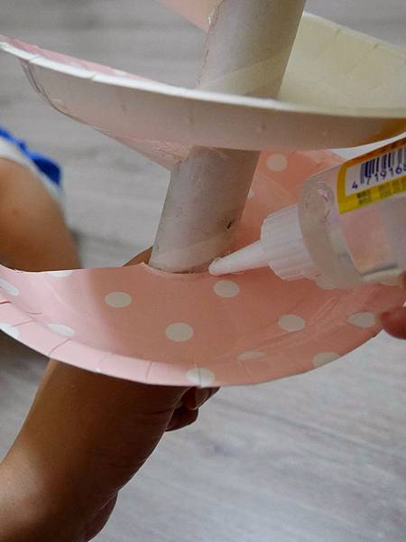 這個動作自己做會有點不好弄,因為要把變成螺旋狀的盤子拉開並黏在棍子上,並不那麼容易~
