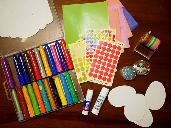 ●裝飾的素材(彩色紙、圓圓貼紙、可愛貼紙、亮片、紙膠帶....)