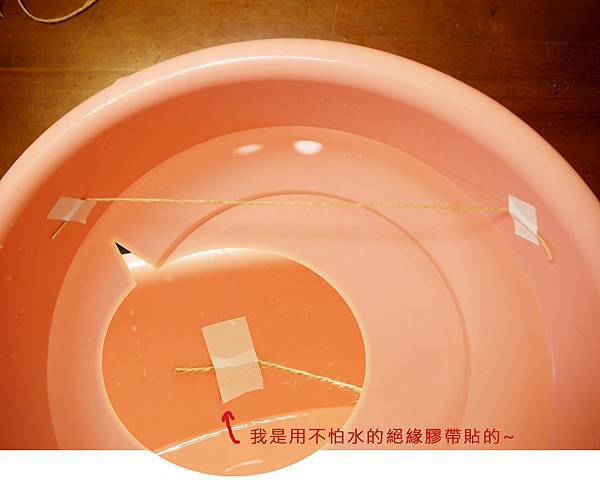 4.在臉盆的一邊黏上繩子,當作終點