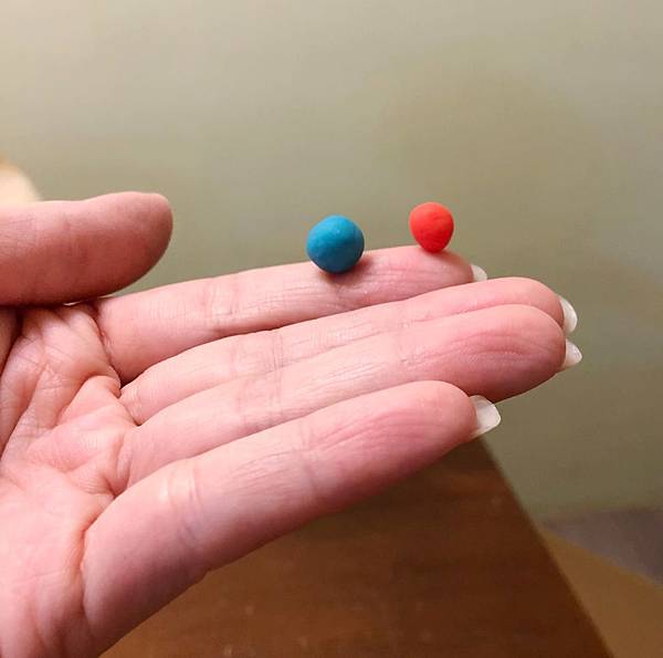 1.取紅色和藍色黏土各一小塊,搓出長長的一小段線條。