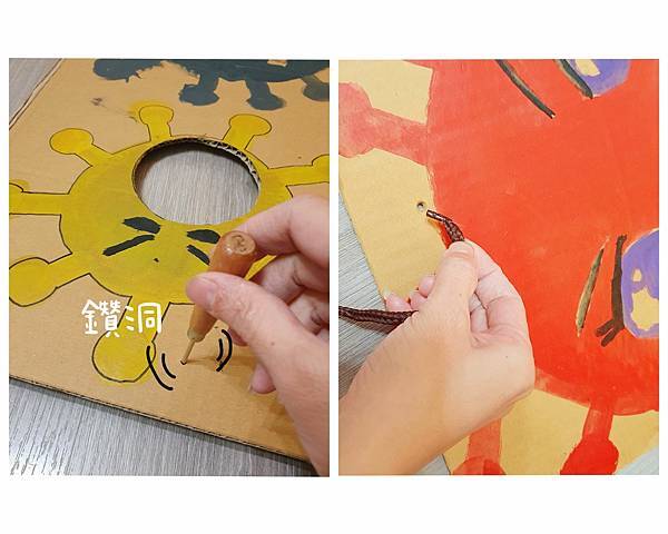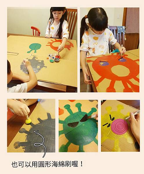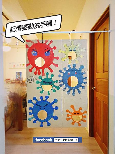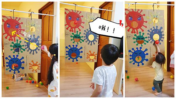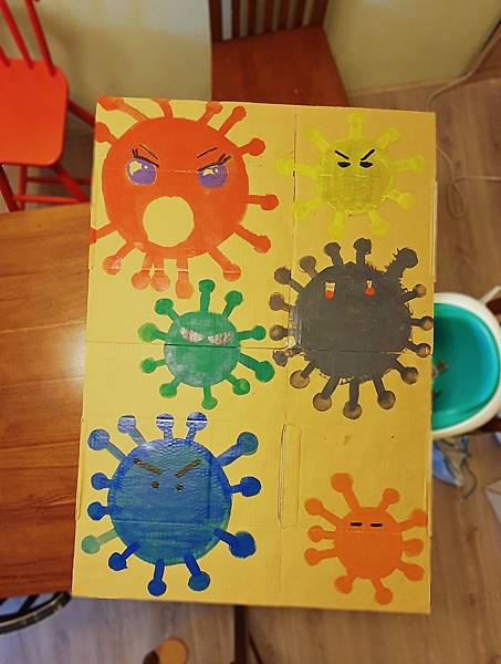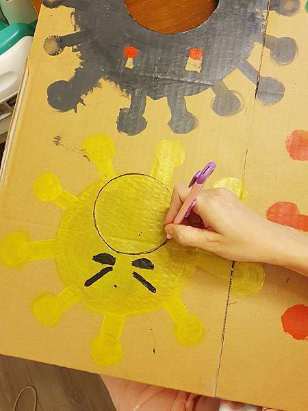 在紙箱上畫上可愛版的病毒並挖洞,接著就是用力的給它打下去啦